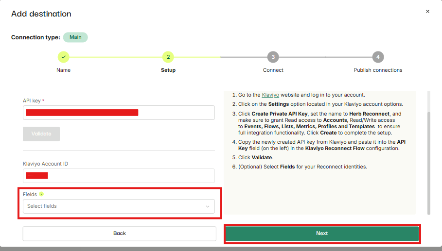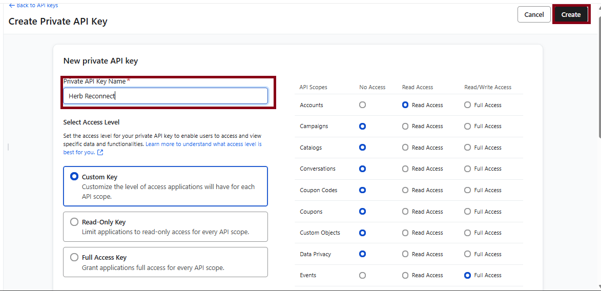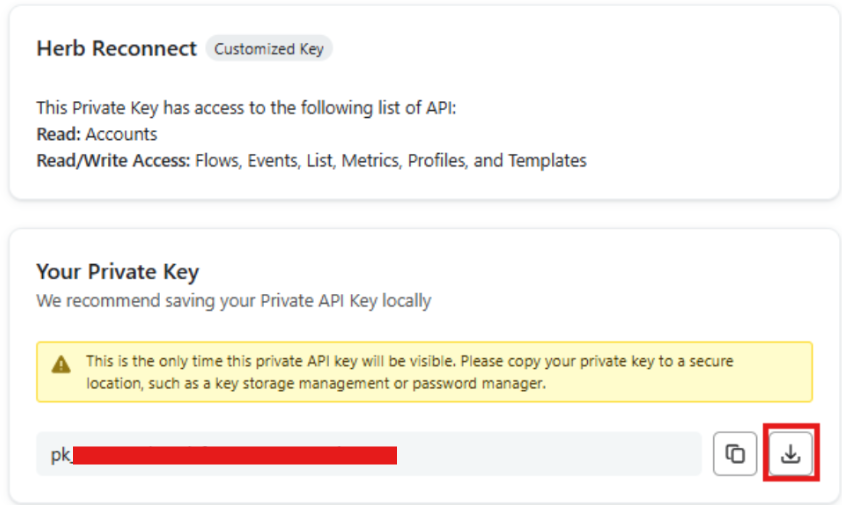 c. Click Create Private API Key, set the name to Herb Reconnect, and make sure to grant Read access to Accounts, Read/Write access to Events, Flows, Lists, Metrics, Profiles and Templates to ensure full integration functionality. Click Create to complete the setup.